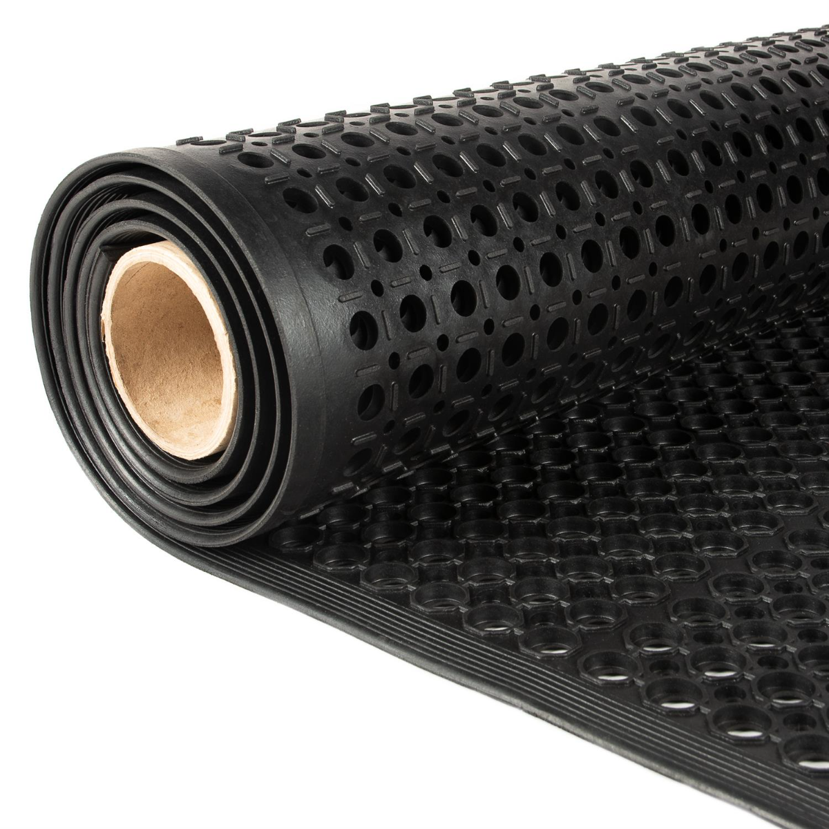 The Rubber Anti-fatigue Mat on roll with dimension 90 x 594 cm is an extremely robust, non-slip, water-permeable, and frost-resistant mat that also provides mild sound insulation. This rubber mat is versatile and ideal for kitchens, workplaces, wet areas, slippery surfaces, muddy paths, and snowy environments. These rubber mats can be used both indoors and outdoors.
